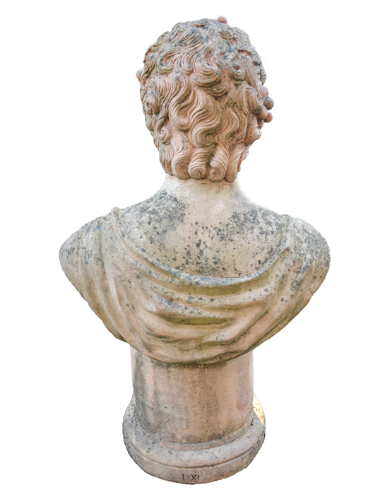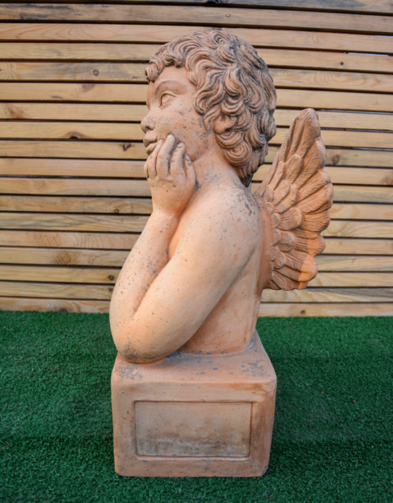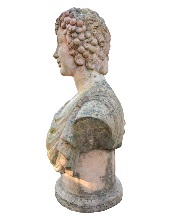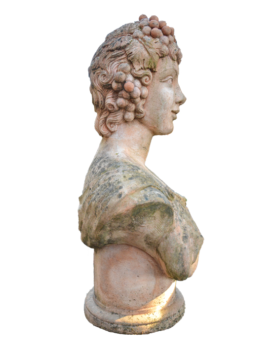 View the embedded image gallery online at: https://www.tonazzosrl.it/index.php/prodotti/giardino/angeli-fate-e-elfi?filter_catid=92#sigProIdcc61c53d89 Busto Bacco in terracotta di Impruneta.