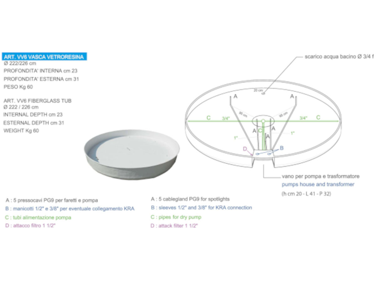 VV6 Vasca in vetroresina :   h 23/31 cm + ø 226 cm + peso kg 60